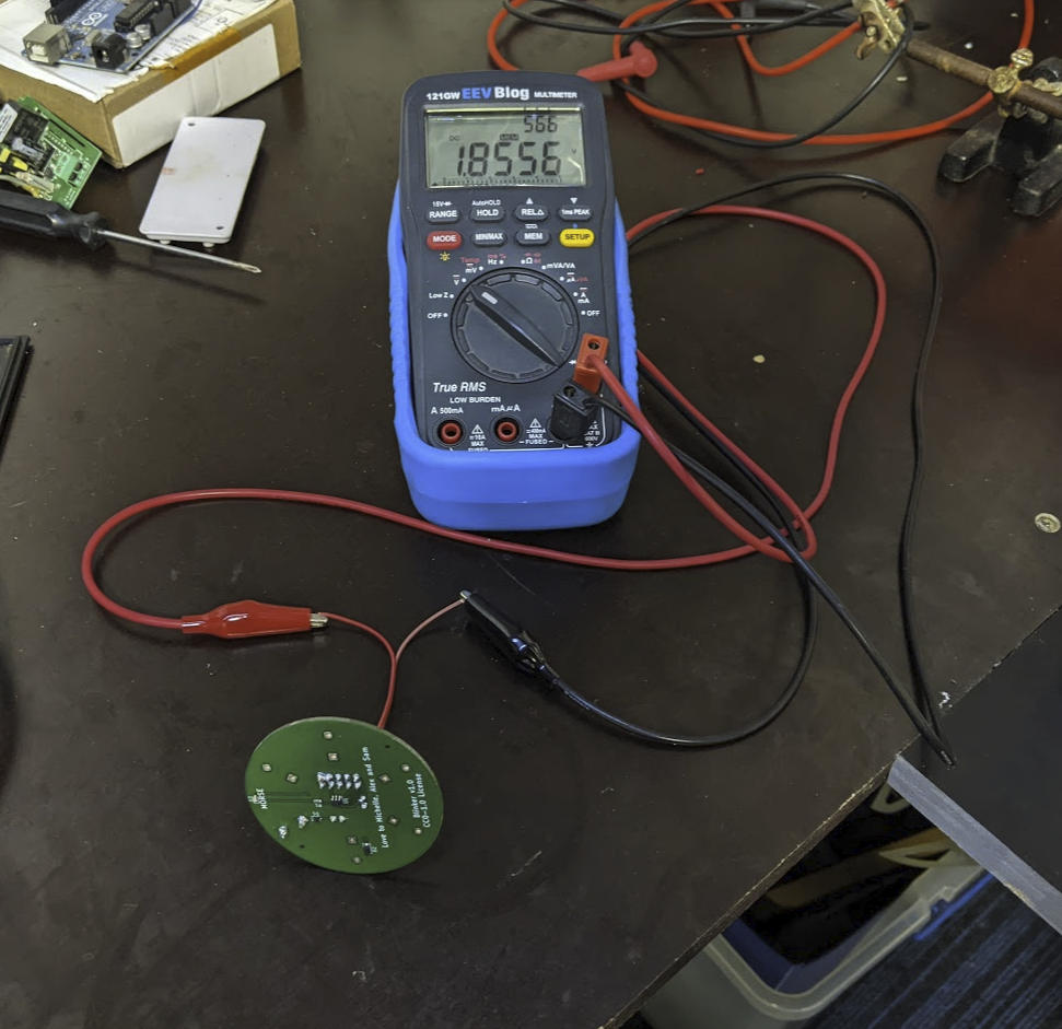 As of running these tests the blinker has only one 25 farad supercap installed. The final design allows for six 40 farad caps, so it currently has around 10% of the design energy capacity.