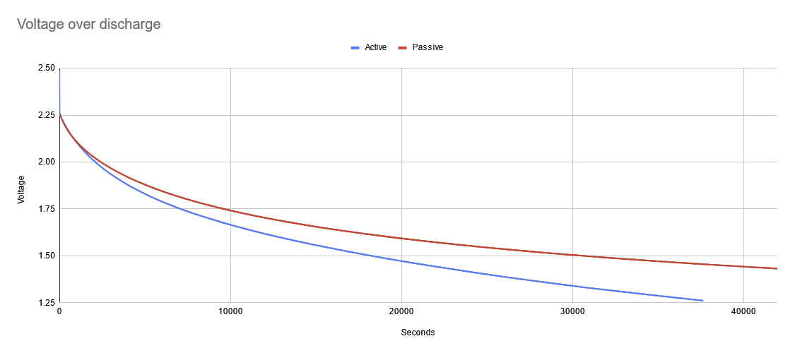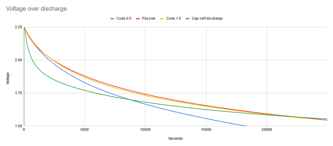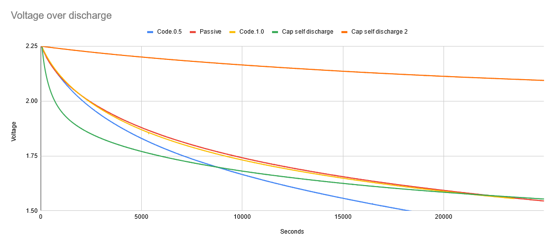 I wanted to confirm the source of my passive losses. I suspect the voltage limiting Zener diode. It's sized to handle sinking a reasonable amount of current (around 100mA) to ground to avoid overcharging the capacitors. The bigger the Zener, the more leakage. The datasheet of the one I'm using (MM1Z2V4, I think. JLC part C96629 isn't in their catalogue anymore and I didn't store the actual part number anywhere…) specifies a 120µA leakage current at 1V, which is in the right ballpark. I re-ran the passive discharge test but with a supercap charged directly from my benchtop supply and got a big surprise: