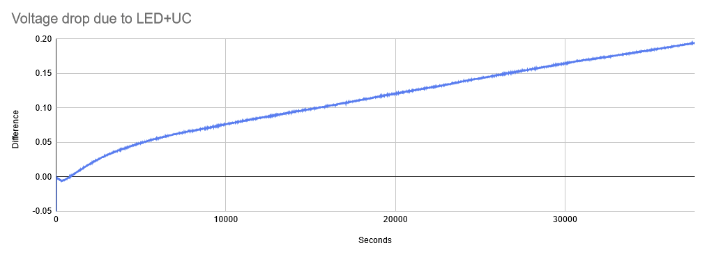 This graph shows the difference between the two curves above - the voltage drop that can be attributed to the microcontroller+LED doing their job. Somewhere between 1.5v and 1.4293v the LED became too dim to see in a dark room.