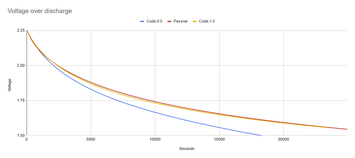 I want to measure the voltage over time as the device discharges so I can calculate how much power each component uses. I will run the following tests: