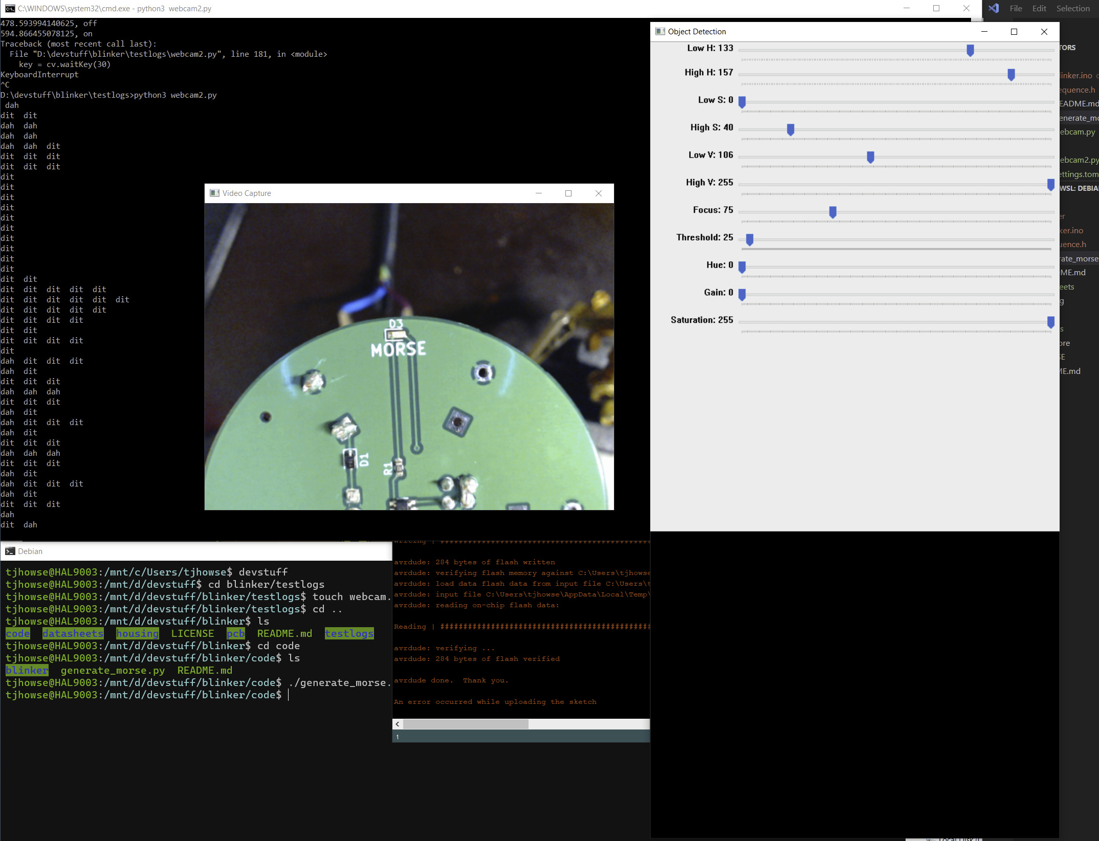 I don't (yet) know how to read Morse code, but I wanted to validate whether I was blinking out the message correctly, and looping around at the end. I wrote some shockingly dodgy OpenCV code to watch the LED through a webcam and decode the Morse: