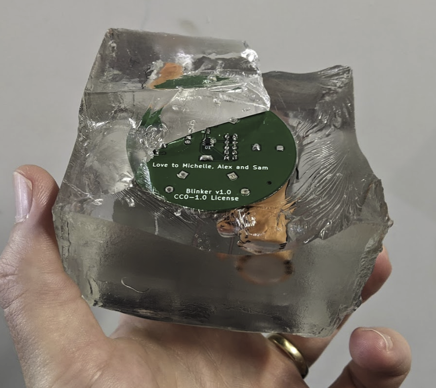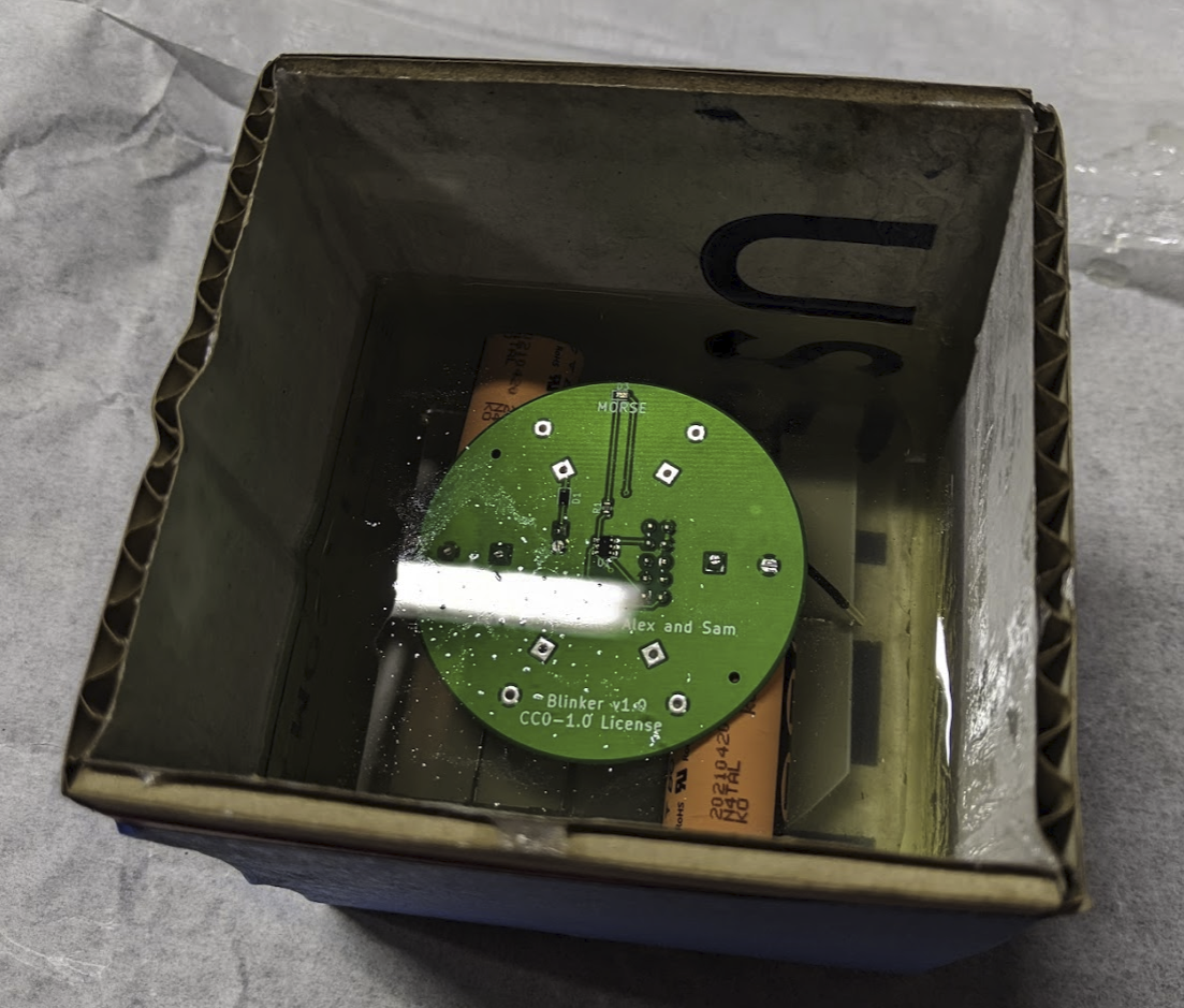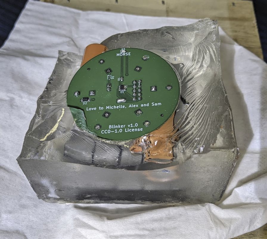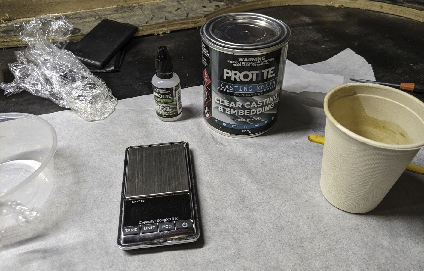 I wanted to run a medium-duration test of the electrically-complete blinker before going through all the trouble and expense of encasing it in aluminium and glass. I decided to cast the electronics in transparent resin. This would be reasonably mechanically and chemically robust, but it would degrade in sunlight over a few years, turning yellow and crumbling. However this would be a reasonable test for any drastic short-term problems with the electronics.
