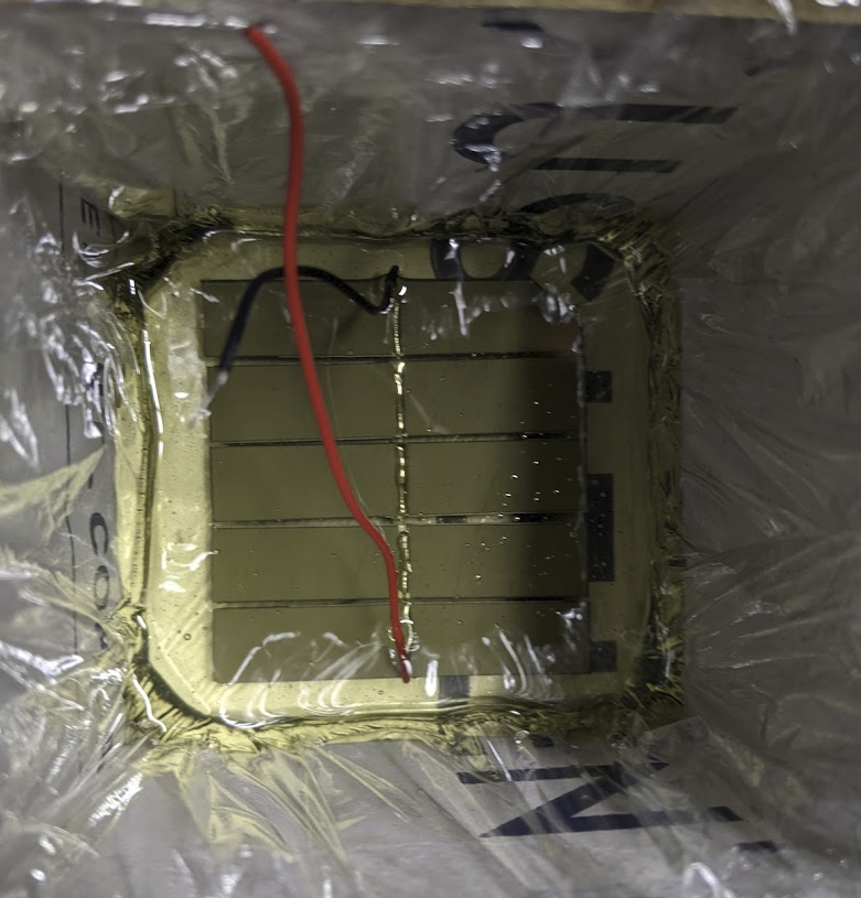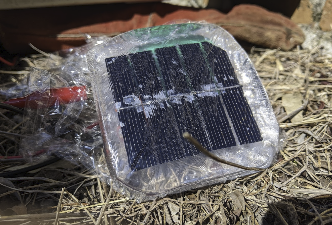 I was reasonably happy with this result. There is some grey discolouration on the solar cells visible in that photo. That discolouration wasn't present when I took the panel out of the mould. It formed shortly after I put it in the sun for this test. It seems to have been formed by some combination of: