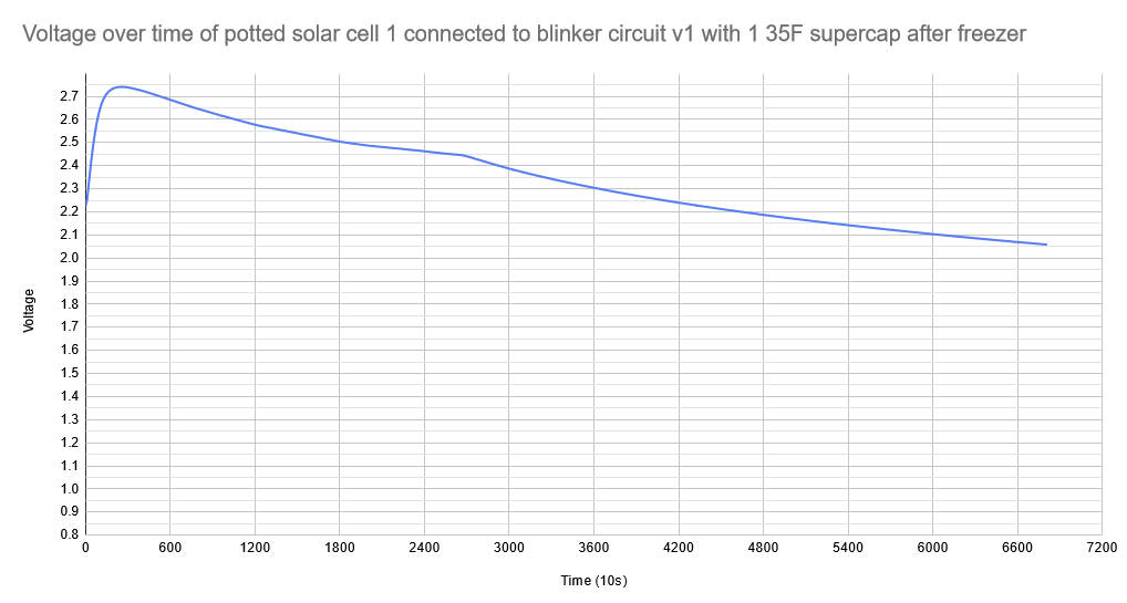 I was puzzling over why the voltage dropped off so quickly. I wanted to check whether it was panel degradation related to the discolouration or due to the panel heating up inside a pretty good thermal insulator. I put the whole shebang in the freezer for a while to see if that had any effect.
