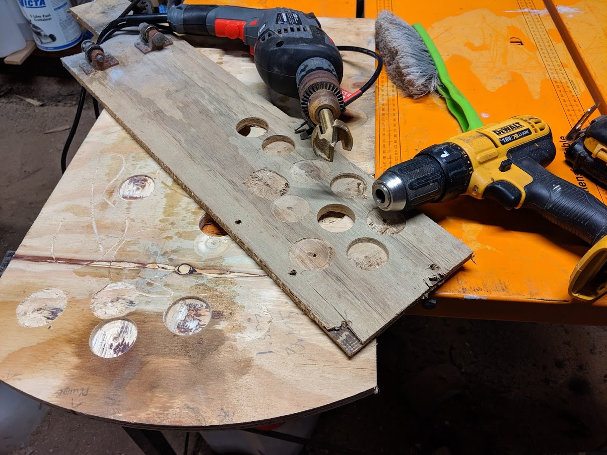 The only good results I could get were using a drill press. This wasn't going to work in the centre of the playing surface, it needs to be hand-drilled.