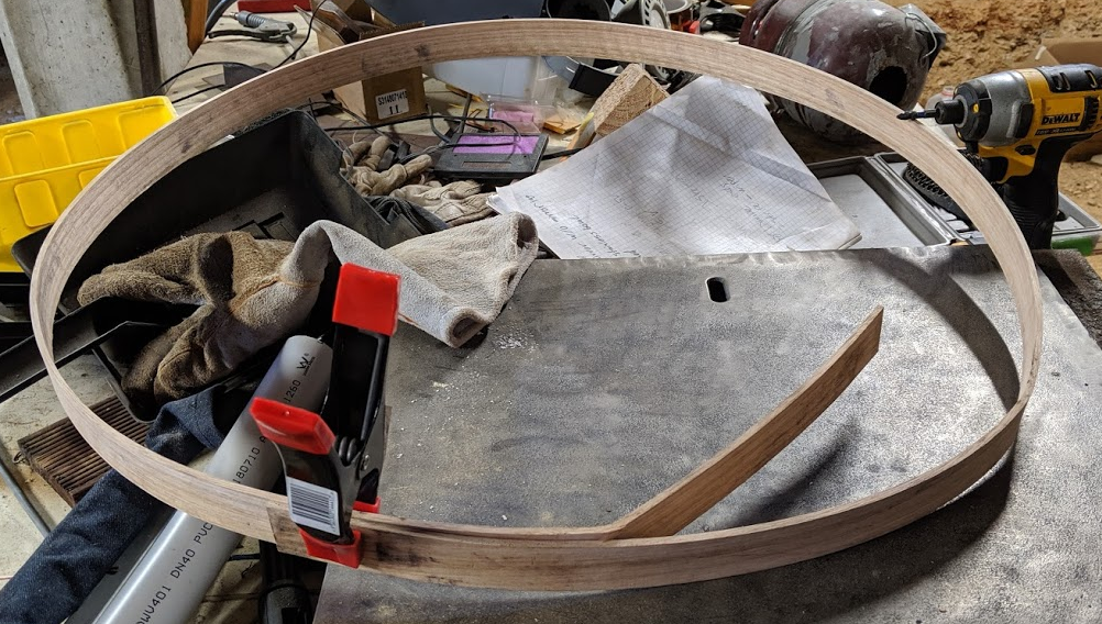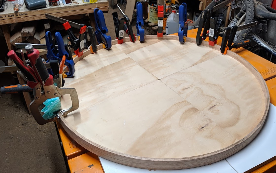 It was much easier to apply this second layer with something to clamp to. I ended up with some gaps between the two layers after the glue dried. I worked some PVA into the gap with a brush and pinched the edge with a clamp. This worked well. The two joins in the outer ring look very nice, almost perfectly flush. I'm happy with how they look. If I were to do this again I would probably reduce the diameter of the circle a little such that the outer band was a bit under 2.4m, so I could use a whole strip and only have one join per edge layer.