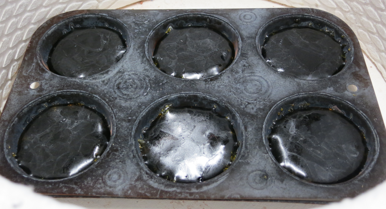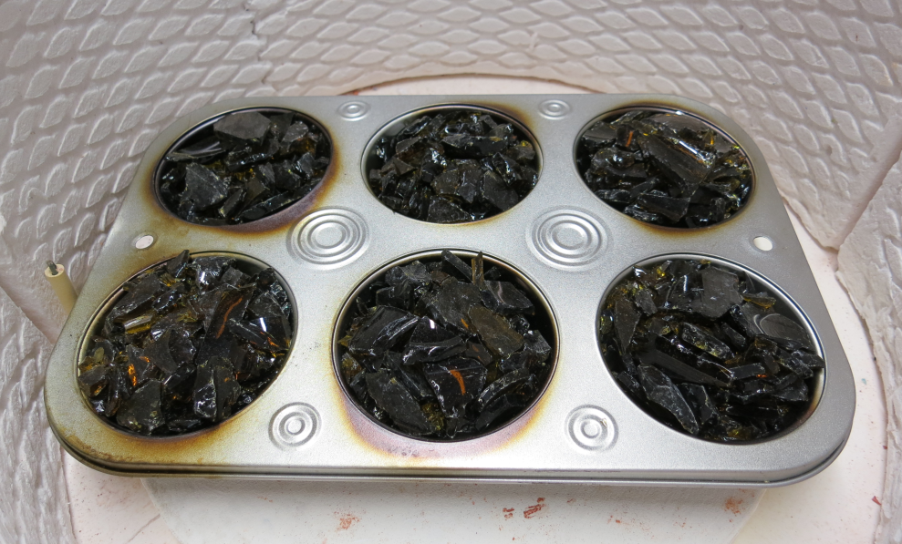 I dried the wet crushed glass in a pot on a hotplate. I weighed out six 145g quantities of glass into a muffin pan and melted it in my furnace.