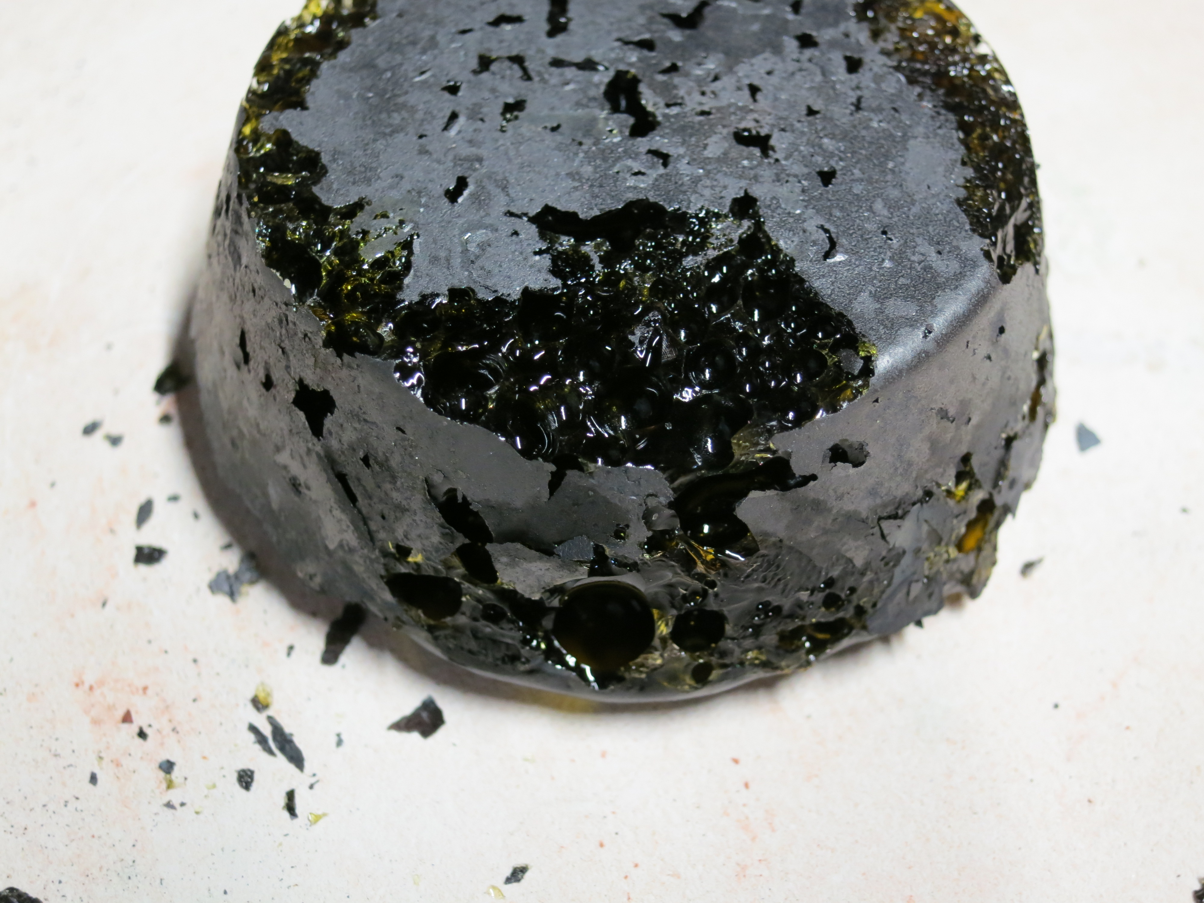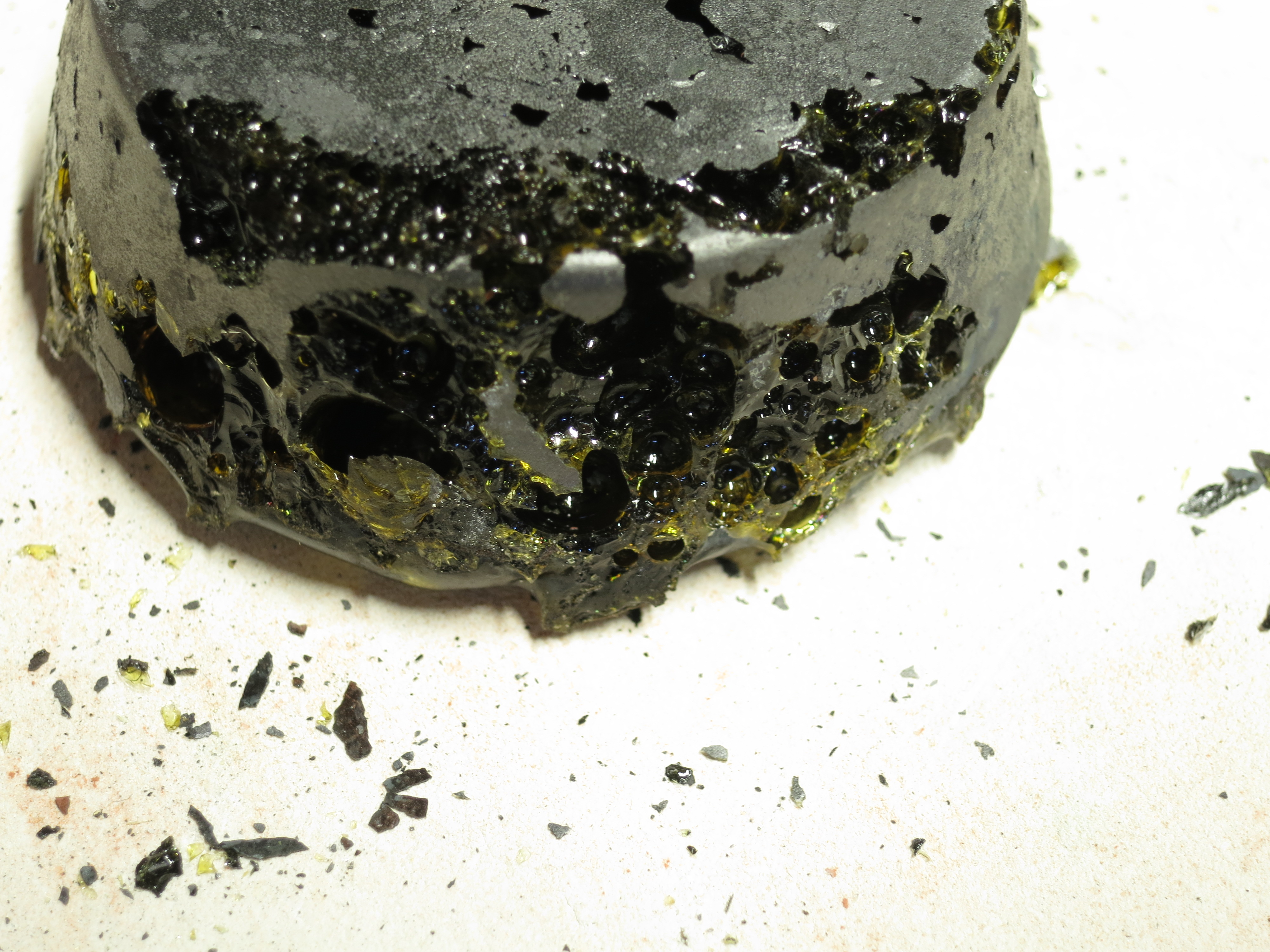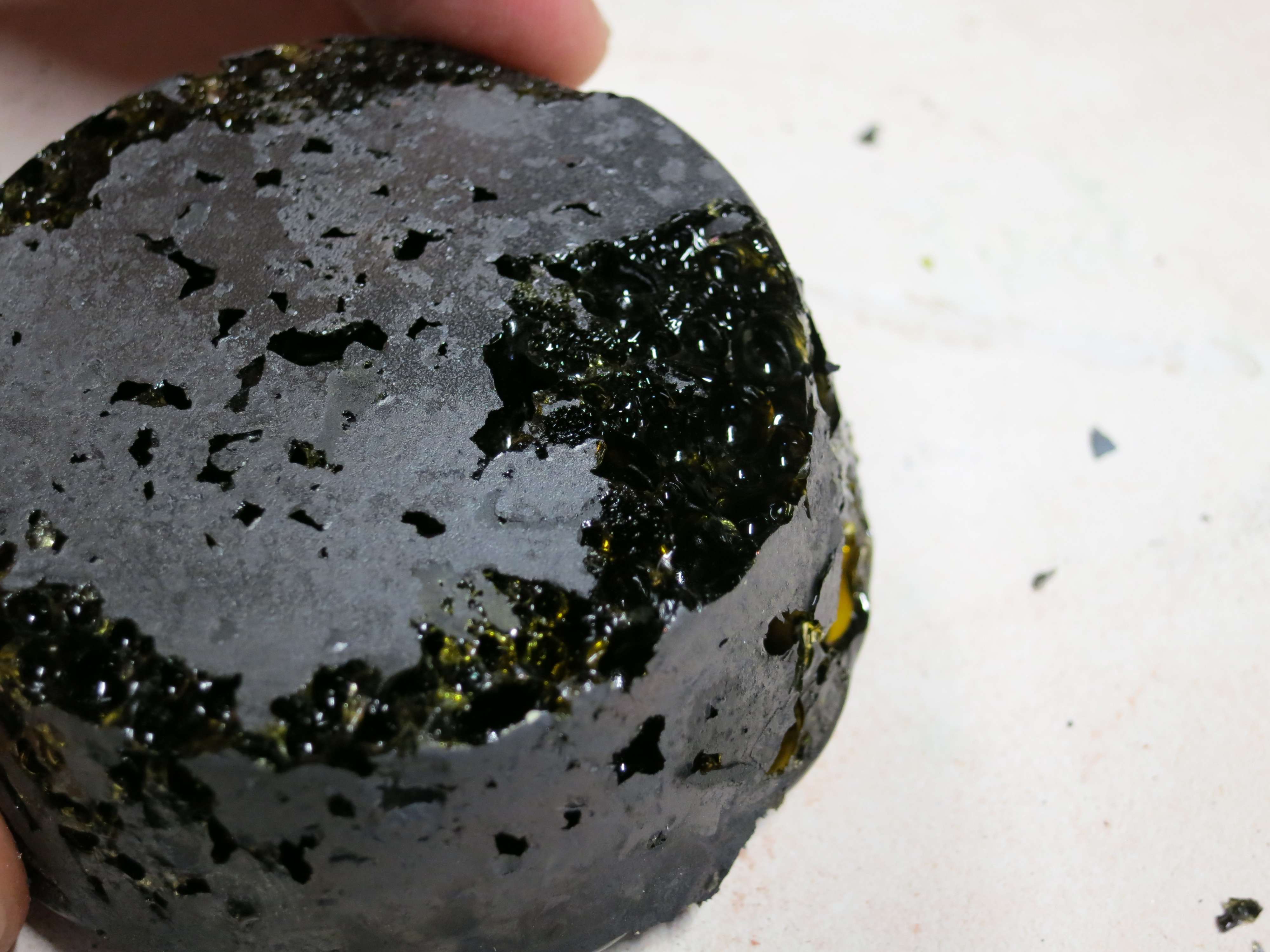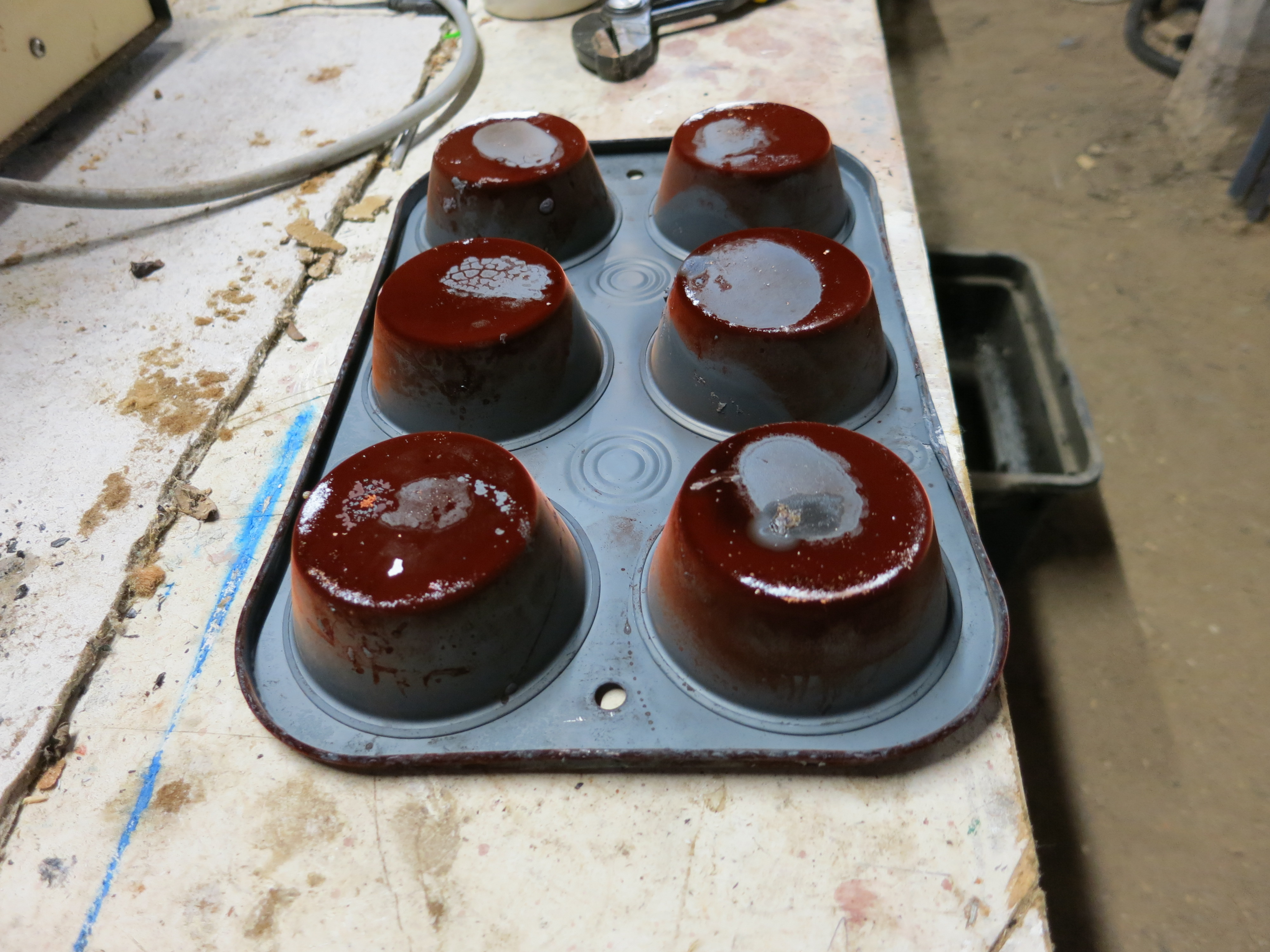 I suspect the coating on the muffin tin decomposed at high temperatures and bubbled gas through my slugs. I threw one on the linisher to see whether it would be workable for testing polishing techniques, but the bubbles are very close to the surface and I broke through almost immediately. This results in glass fragments getting caught between the polishing surfaces and gouging around.