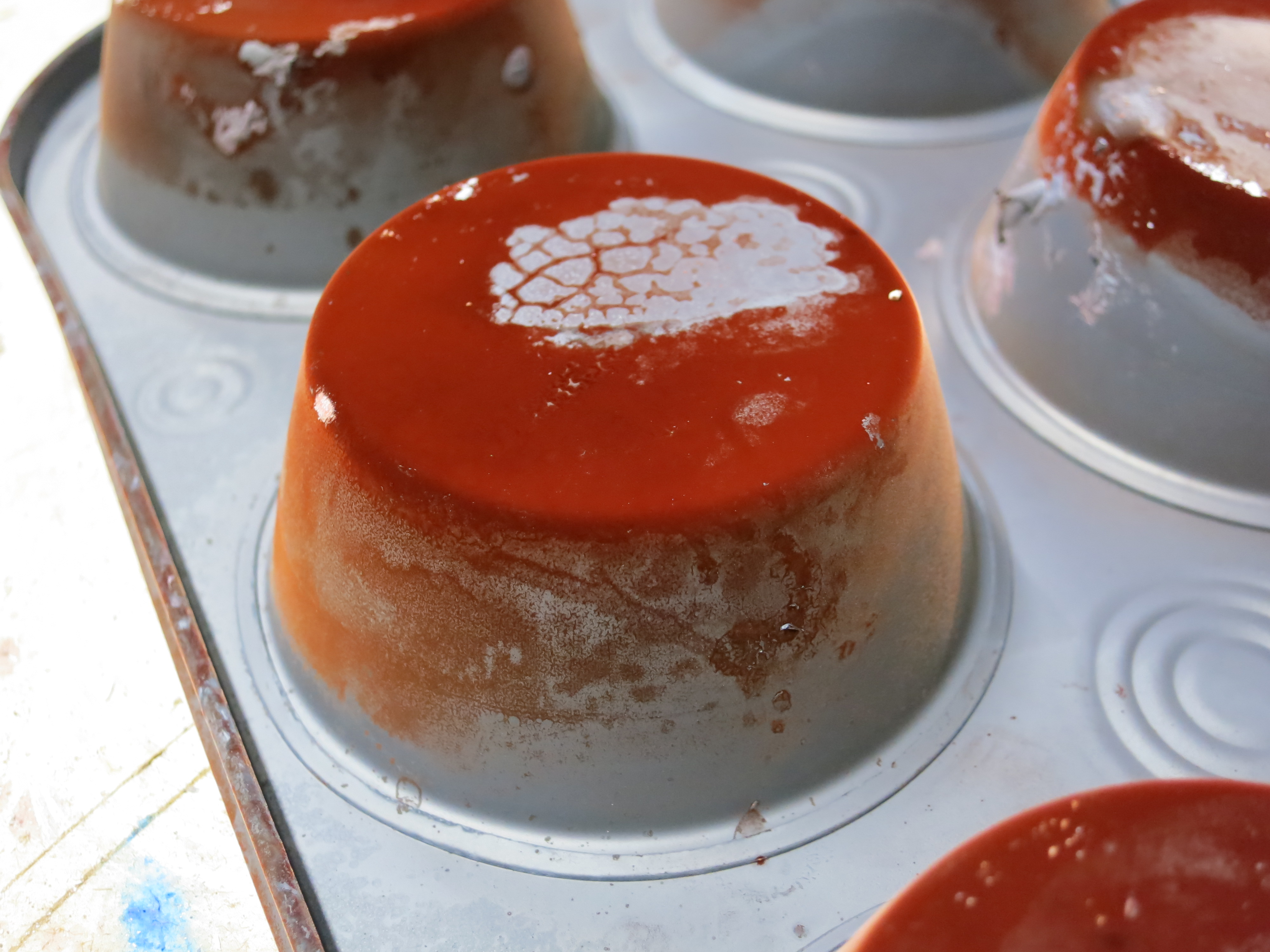 Next time I will try to buy an uncoated stainless steel muffin tin, or I will pre-fire the tin on a dry run to burn off any coatings, then add a layer of release agent.